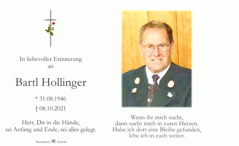 Nur wenige Wochen nach seinem 75. Geburtstag verstarb Bartholomäus Hollinger aus Prien-Elperting. Wie groß seine Wertschätzung über seine Familie hinaus war, zeigte die überwältigende Teilnahme bei der Trauerfeier in der Wallfahrtskirche von St. Salvator. Der Söllhubener Trachtler Bartl Hollinger war über seinen Heimatverein „D´Hochlandler“, über das Gebiet Simssee und über den großen Gauverband I hinaus aktiv und beliebt, er war eine bayernweite Trachtler-Persönlichkeit – das verdeutlichten die Nachrufe.