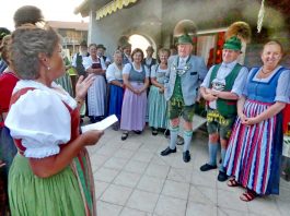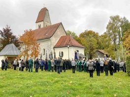 An der Trauerfeier in St. Salvator beteiligten sich die Kirchgänger zum übergroßen Teil im Freien. Lediglich die Fahne des Söllhubener Trachtenvereins und die Standarte des Gauverbandes I fanden Platz im Altarraum, weitere 18 Fahnen säumten das äußere Trauerbild. Krankenhaus-Seelsorger Peter Bergmaier erinnert an das Leben des Verstorbenen. Bartl Hollinger wuchs in Söllhuben mit zwei Schwestern und drei Brüdern auf, bereits im Alter von sieben Jahren verlor er seine Mutter. Der Schule in Söllhuben und der Malerlehre in Riedering folgten die eineinhalbjährige Bundeswehrzeit bei der Tragtierkompanie in Bad Reichenhall, 25 Jahre als Maler bei der Rosenheimer Firma Fischbacher sowie von 1990 bis zur Rente die Beschäftigung beim Priener Kreiskrankenhaus. Bereits früh verlor er im Jahr 1985 seine erste Frau Luise vom Wastlhof in Elperting, wo er sich für seine Familie ein Haus erbaute. Im Krankenhaus-Dienst lernte er seine zweite Frau Resi kennen und mit ihr setzte er das Familienleben mit Sohn Barthi aus erster Ehe und mit Tochter Elisabeth aus zweiter Ehe sowie mit den vier Enkeltöchtern fort. Im Mai diesen Jahres konnte er noch seine Silberne Hochzeit feiern.