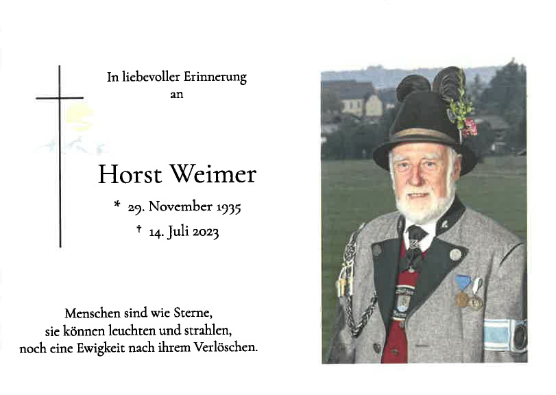 Im Alter von 87 Jahren verstarb überraschend Horst Weimer aus Bernau. Die Trauerfeier auf dem Friedhof von Bernau leitete Matthias Wicha als Hauptmann der Gebirgsschützenkompanie Bernau.