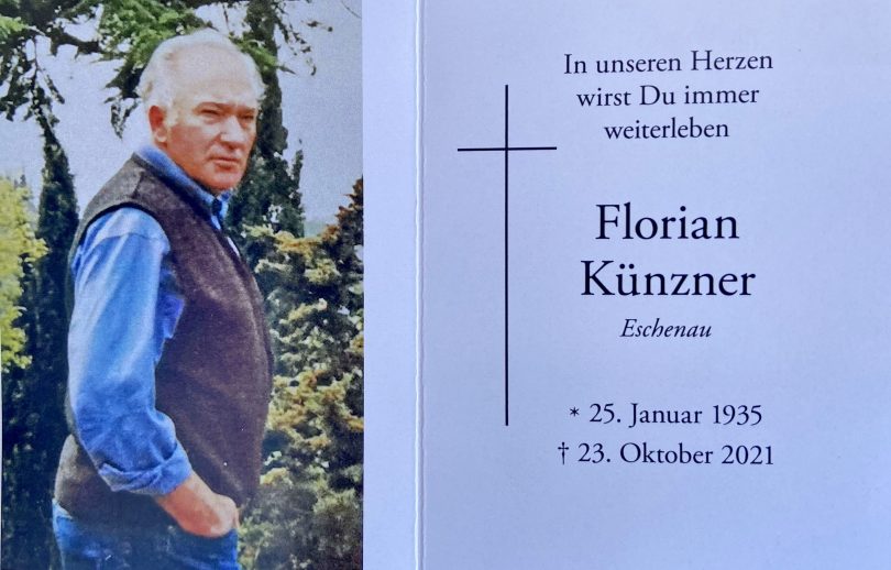 Im Alter von 86 Jahren verstarb nach kurzem Krankenhaus-Aufenthalt Florian Künzner aus Eschenau bei Pittenhart Mit seinem Tod hat die Priener Blaskapelle einen Alt-Musikanten verloren, der über 40 Jahre die Musik und die Auftritte zu Hause und sogar weltweit prägte. Daran erinnerten in ihren Nachrufen bei der Trauerfeier in Pittenhart Musikvorstand Stefan Hackenberg und der ehemalige Dirigent Sebastian Weyerer. Den Gottesdienst in der Pittenharter Pfarrkiche hielt Pfarrer i. R. Konrad Kronast, für die musikalische Gestaltung sorgte der örtliche Kirchenchor.
