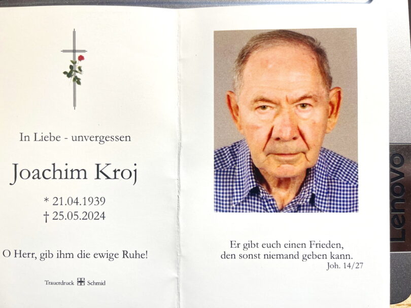 Joachim Kroj ist in der oberschlesischen Stadt Scharley als ältester von vier Geschwistern aufgewachsen. Da die Familie im damaligen Grenzgebiet lebte, durften unter Umständen viele Deutsch-Oberschlesier  in ihrer Heimat bleiben, wenn sie glaubhaft nachweisen konnten, dass sie auch etwas polnisch sprechen konnten. Da entschieden sich die Eltern, vorerst mit den Kindern in der Heimat zu bleiben und Joachim konnte in Beuthen zur Schule gehen. Anschließend besuchte er ein Polytechnikum, erwarb sich parallel die Hochschulreife und erlernte den Beruf des Elektrotechnikers. Bis 1989 arbeitete er in einer großen Bergbaufirma in Oberschlesien. In jungen Jahren lernte er seine Ehefrau Alice kennen, er ging mit ihr 1966 den lebenslangen Ehebund ein und sie erfreuten sich über ihre gemeinsame Tochter Justine. Aus verschiedenen Gründen war eine gemeinsame Auswanderung nach Westdeutschland nicht möglich, im Juni 1989 machte sich Joachim Kroj alleine auf den Weg und er kam nach Prien, dort traf er auf zwei seiner Tanten. Im September kamen Frau und Tochter nach und sie bezogen gemeinsam eine Wohnung in Prien. Ab November bis zu seinem Ruhestand arbeitete Joachim Kroj bei der Firma Drexler Elektromotoren. Bereits mit 72 Jahren kam es zu gesundheitlichen Problemen. Bis zuletzt war ihm eine Pflege daheim von Ehefrau und Tochter gegönnt. Die musikalische Gestaltung des Gottesdienstes in der Pfarrkirche vor dem Urnengang im Priener Friedhof übernahm Kirchenmusiker Bartholomäus Prankl unter anderem mit Lieblingsstücken des Verstorbenen  vom Komponisten Giuseppe Verdi.