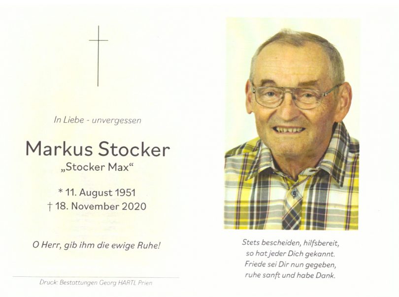 Im Alter von 69 Jahren verstarb nach einem arbeitsreichen und seiner Familie zugewandten Leben der Zimmerermeister und Bautechniker Markus Stocker. Welch großer Beliebtheit und Wertschätzung sich der allseits genannte „Stocker Max“ erfreute, zeigte die große Anzahl der Trauernden, die sich coronabedingt im weiten Priener Friedhof verteilt einfanden.