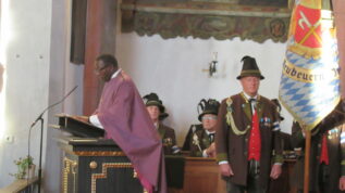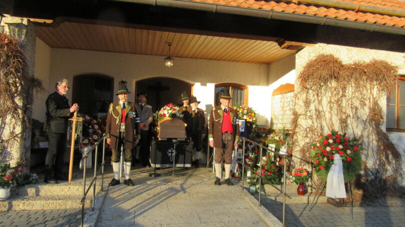 Pfarrer Rudolph am Vormittag haben wir im vertrauten Kreise die Krankensalbung vollzogen, Nachmittag verschied er friedlich und still im Kreise der Familie,wie es sein Wunsch war. Der immer freundliche, offene und großzügige Mitbürger war in den kirchlichen Gremien ein bestimmender Teil. Erneuerungen, bauliche Veränderungen an den Kirchen in Neu-und Altenbeuern begleitete er mit Umsicht, eine neue Orgel in seiner Pfarrkirche am Marktplatz war sicher einer der Höhepunke. Dies in Zusammenarbeit mit Pfarrer Josef Reuder und den vorgegeben Stellen. Bauer vertrat dies oft sehr nachdrücklich. Aufbruch, Wachstum und eine verbindende Gemeinschaft haben diese Generation geprägt, so Bürgermeister Christoph Schneider in seiner Laudatio auf den Verstorbenen. Auch wenn sein Arbeitsleben der frühe Morgen war brachte sich Albert Bauer in die Dorgemeinschaft ein. 16 Jahre, ab dem Jahr 1978 war er Mitglied im Marktgemeinderat. Die Probleme des Marktplatz und der Geschäftswelt trieben ihn an. Und wo es ging brachte er sich ein, wie bei den Festlichkeiten zur 1200 Jahrfeier oder der Marktrechtserhebung. Der Marktplatz war seine Stube das mächtige Haus am Markteingang sein Domizil und Ruheort. Das Haus war immer mit Leben gefüllt, zusammen mit seiner Frau Anna, den vier Kindern und eine weit über 20 köpfige Schar von Enkel und Urenkeln. Aber auch wer einmal ein Dach brauchte fand hier eine Bleibe. Sein sozialer Einsatz prägte ihn. Das Haus am Markt erwarb er Anfang der 60er Jahre. Zahlreiche Um-und Ausbauten unter schwierigsten Bedingungen, das Haus ist unmittelbar an die Felswand des Schloßberg gebaut, wurden von ihm und der größer werdenden Familie mit vier Kindern gemeistert. Bevor es ihn nach Neubeuern zog, in dem Haus war vorher bereits eine Bäckerei, erlernte er bei seinem Vater in Grafing den Bäckerberuf. Früh geprägt war sein Wunsch, dies fort zuführen.Über Arbeitsstellen in Rosenheim und Litzeldorf kam er nach Neubeuern. Die Gründung des Christlichen Sozialwerkes Neubeueren-Nußdorf-Samerberg wurde von Albert Bauer begleitend mitgestalt. Bleibender Wert seines Einsatzes wird die Pfarrwallfahrt nach Birkenstein bleiben, welche vom “Bertl” in den 80er Jahren angeregt wurde und die er mit Nachdruck verfolgte. Die Neubesetzung der verwaisten Pfarrstelle war Grundlage des Bittgang. Was dann auch geschah. Die Wallfahrtskirche war sein Kraftort, ebenso das wöchentliche Rosenkranzgebet in der Pfarrkirche. Eingebunden in zahlreiche Ortsvereine waren ihm Tradition und Brauchtum sehr wichtig und eine Stütze. Hauptmann Sepp Stadler verwies auf die vielen Ausrück-und Arbeitstermine, die der Albert stets mit einer ansprechenden Brotzeit begleitete. Seine Breznstangerl waren ein Markenzeichen von der Bäckerei Bauer. Die Messfeier mitgestaltet vom Kirchenchor und einer großen Besetzung der Beerdigungsmusik gestalteten in Kozelibration Pfarrer Rudolph, Diakon Sepp Stürzer und Pfarrer Dr. Xaver Komba aus Tansaniea. Er wurde in der Zeit als er seine Doktorarbeit in München schrieb, von der Famaile Bauer betreut, fand hier Wohnung. Ein persönlicher Rückblick und ein Lied in seiner Landessprache waren Ehrerbietumg an seine “bayrische “Mama”. Pfarrer Komba berichtete von vielen Aktionen, welche aus der Partnerschaft mit Tansaniea entstanden sind und wo Albert Bauer stark eigebunden war. Die Fahnen seines Heimatrachtenvereins aus Grafing, des Trachtrenverein Edelweiß Neubeuern, der Gebirgschützen und der KAB fanden sich um den Altar ein. Familienmtglieder und befreundete Kameraden aus den Vereinen führten den Leichenzug zur letzten Ruhestätte an, übergaben dort den Leichnam der geweihten Erde.
