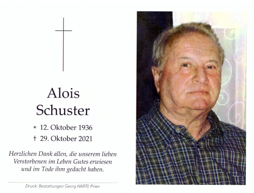 Kurz nach seinem 85. Geburtstag und wenige Wochen nach schwerer Krankheit verstarb Alois Schuster aus Prien-Bachham. Bei den Trauerfeierlichkeiten in der Wallfahrtskirche St. Salvator erinnerte Pfarrvikar Gottfried Grengel an den Taxi- und Omnibusunternehmer und an dessen Arbeitsfleiß bis ins hohe Alter. Die musikalische Gestaltung des Requiems erfolgte mit Orgel- und Zitherweisen sowie mit Gesang der Inntaler Sänger.