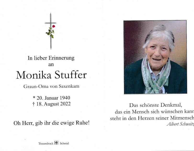 Ein arbeitsreiches Schaffen in der Landwirtschaft, geprägt vom ländlichen Leben aus der Kinderzeit fand mit dem Sterben in heimischer, vertrauter Umgebung Ihr Ende. Im 82. Lebensjahr verschied auf dem Anwesen in Saxenkam Frau Monika Stuffer, Graun-Oma, die in Apfelkam, Gemeinde Rohrdorf geboren war.