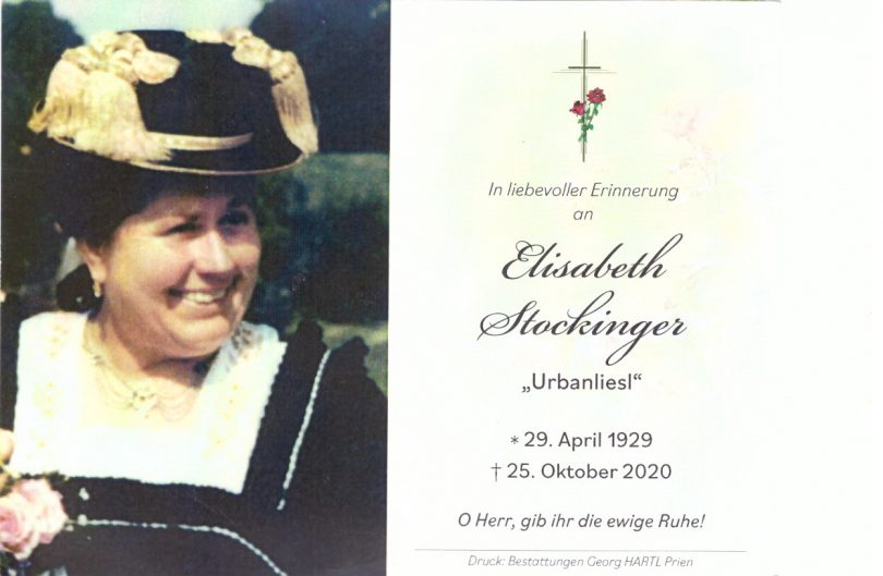 Ein Leben für Familie, Landwirtschaft und Chiemgauer Brauchtum ging im 91. Lebensjahr für Elisabeth Stockinger aus Prien-Hoherting zu Ende. Bei der Trauerfeier in der Priener Pfarrkirche „Maria Himmelfahrt“ erinnerte Pater Benny an das Leben der „Urban-Liesl“, die als jüngstes von fünf Kindern auf dem Moar-Hof in Dirnsberg auf der Ratzingerhöhe begann. „Mit sieben Jahren verlor sie ihren Vater, ihre drei Brüder mussten in den Krieg ziehen, nur Bruder Alois kehrte von diesem wieder zurück, da hatte sie keine leichte Zeit. Das bäuerliche Arbeiten, das Dasein für die Mutter und Geschwister sowie ihr tiefer Glaube prägten den Charakter in ihrer Jugend“ – so der Geistliche, der weiter ausführte, dass Elisabeth Stockinger im Jahr 1954 ihren Mann Hans heiratete, mit ihm die Landwirtschaft in Hoherting auf dem „Urban-Hof“ führte und sich an den Söhnen Sepp und Hans sowie bis zuletzt an den vier Enkeln und 11 Urenkel-Kindern erfreute. Die musikalische Gestaltung in der Pfarrkirche übernahm der Chiemseewinkl-Dreigesang mit volksmusikalischen und alpenländischen Weisen. Auf dem Priener Friedhof erklangen Weisen des Laubensteiner-Flügelhorn-Duos Andreas Hilger und Andreas Wörndl. Gleich drei Trachtenvereinen, die mit ihren Fahnenabordnungen zugegen waren, gehörte Elisabeth Stockinger an. 1949 trat sie dem Trachtenverein „Daxenwinkler“ Atzing bei und gehörte diesem anfangs zusammen mit ihrem Bruder, dem „Moar Alois“ als aktives Trachtendirndl an. Stellvertretender Vorstand Konrad Huber erinnerte in seinem Nachruf, dass die Verstorbene 1975 zum Ehrenmitglied ernannt wurde und mehrere Auszeichnungen vom Chiemgau-Alpenverband und vom Trachtenverein Atzing erhielt. Als 1957 in Greimharting der Trachtenverein „Ratzingerhöhe“ gegründet wurde, trat sie auch diesem bei. Vorstand Franz Fischer dankte ebenfalls für die lange Treue als Mitglied und als Röckefrau. Nachdem die Söhne Sepp und Hans beim Priener Trachtenverein recht erfolgreiche Plattler waren, trat sie 1978 auch dem GTEV Prien als Mitglied bei. Stellvertretender Vorstand Klaus Löhmann würdigte seinerseits am offenen Grab die Wertschätzung von Elisabeth Stockinger gegenüber der Trachtensache sowie ihre Liebe zu Heimat und Brauchtum.