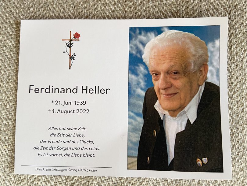 Im Alter von 83 Jahren verstarb nach kurzer Krankheit Ferdinand Heller aus Prien. In einem feierlichen Wortgottesdienst in der Pfarrkirche „Mariä Himmelfahrt“ erinnerte Schwester Juliane Michaelsamy vom indischen Orden der Missionsfranziskanerinnen von Aloisius von Gonzaga an das ausgefüllte Leben des Verstorbenen. Bereits im Alter von sechs Jahren wurde er aus seiner sudetendeutschen Heimat mit seiner Mutter, seiner Zwillingsschwester Anna und seinem älteren Bruder Helmut vertrieben. Sie fanden in Wildenwart Aufnahme, dort besuchte er ab 1948 die Schule alsdann machte er eine Lehre beim Waagenbauer Dietl in Prien-Atzing. Beruflich war Ferdinand Heller ab 1962 bis zum Renteneintritt bei der Deutschen Bundesbahn angestellt.