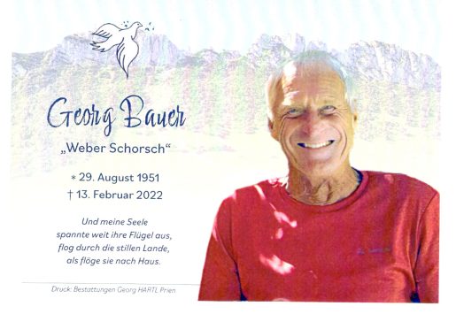Mit dem plötzlichen Tod von Georg Bauer im Alter von 71 Jahren hat die Chiemsee-Gemeinde Bernau eine starke Persönlichkeit verloren, die sich über seine Familie hinaus in vielfältiger Weise um Kultur und Vereine in seinem Heimatort verdient gemacht hat. Pfarrvikar Gottfried Grengel bezeichnete den aus dem Ortsteil Kraimoos stammenden „Weber-Schorsch“ als einen Mann mit besonderer Herzensstärke, der in vielen Bereichen des öffentlichen Lebens dank seines Engagements tiefe Spuren hinterlassen hat.