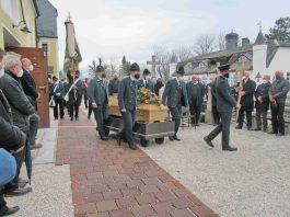 „Die Kraft und Energie für seine Aktivitäten hat Georg Bauer seiner Herkunft vom Weberbauer in Kraimoos zu verdanken. Sein Zuhause und sein Familienglück förderten seine vielen Talente und Fähigkeiten“ – so Pfarrvikar Grengel, der noch daran erinnerte, dass Georg Bauer mit seiner Frau Monika 43 Jahre zusammen war und dass er für seine drei Kinder und für das erst vor wenigen Monaten zur Welt gekommene Enkelkind ein stolzes Familienoberhaupt war. Sein beruflicher Werdegang begann –wie bei seinem Vater – mit einer Maurer-Lehre an der Fachoberschule Rosenheim, es folgten das Ingenieur-Studium an der Fachhochschule München und die Selbstständigkeit mit einem Büro in seinem Zuhause. Die musikalische Gestaltung in der Kirche und auf dem Friedhof übernahmen die mit rund 50 Musikanten spielende Musikkapelle Bernau unter der Leitung von Dirigent Albert Osterhammer sowie bei der Trauerhalle eine Hornisten-Gruppe.