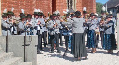 Dieser Wunsch konnte nunmehr erfüllt werden, denn in der Überseer Kirche waren 100 Trauergäste sowie auf der Empore 16 Mann als Teil der Blaskapelle zugelassen. Die musikalische Gestaltung in der Kirche übernahmen die Blasmusikanten zusammen mit Organisten Christian Dengler. Die Trauerfeier hielt Dekan Georg Lindl, er erinnerte in seiner Predigt daran, dass Georg Greilhuber viel für die Mitmenschen getan hat und deshalb auch verdient hat, in der Öffentlichkeit beerdigt zu werden. Weiters skizzierte Dekan Lindl den Lebensweg von Georg Greilhuber wie folgt: „Die Geburt erfolgte am Neujahrstag des Kriegsjahres 1944 in der ländlichen Idylle des elterlichen Bauernhofes in Gänsbach bei Greimharting, nach dem Volksschulbesuch und einer Maurerlehre waren die Bundeswehr sowie die Meister- und Technikerschule in München wichtige Stationen auf dem Weg zum Baustellenleiter und zum bis zuletzt ausgeübten Beruf als selbstständiger Bauingenieur“. Des öfteren musste Georg Greilhuber schwere Schicksalsschläge hinnehmen, so beim frühen Tod seines Vaters, beim Tod seiner Tochter Petra im Jahr 1995 im Alter von nur 20 Jahren und beim Tod seiner im Jahr 1971 geehelichten Ehefrau Anna, die mit nur 53 Jahren im Jahr 2001 verstarb. „Nach der Hochzeit bewirtschaftete er mit seiner Frau den Gießnerhof in Übersee und gemeinsam hatten sie viel Freude an der Ferienpension und mit den Haflinger-Pferden“ – so der Geistliche, der Georg Greilhuber als starken Charakter, mit eigenem Willen, direkt, fleißig, vielfältig interessiert und engagiert bezeichnete. „Familie, Beruf, Blasmusik, Pferde – all das waren seine Leidenschaften“ – gemäß diesen Worten von Dekan Lindl waren auch die Nachrufe auf dem Friedhof geprägt. Nach einem Trauermarsch zur Grabstätte dankte Christian Korner als Erster Vorstand vom Musikverein Übersee-Feldwies dafür, dass Georg Greilhuber seit seiner passiven Mitgliedschaft im Jahr 1977 durch viele Veranstaltungs- und Konzertbesuche der Gemeinschaft verbunden war. Für den Trachtenverein „D´Buchwäldler“ Übersee würdigte Werner Gnadl die 43jährige Vereinstreue mit Worten des Dankes und mit einem Fahnengruß. Seit 1967 gehörte der Verstorbene der Krieger- und Soldatenkameradschaft Prien an, deren Erster Vorsitzender Georg Fischer erinnerte daran, dass Georg Greilhuber vom 1. Juli 1964 bis 31. Dezember 1965 bei den Gebirgsjägern in Bischofswiesen Bundeswehr-Dienst leistete und dass er dem Verein seit 1967 mit seinen musikalischen Talenten bei vielen Versteigerungen, Veranstaltungen und Vereinsausflügen Freude bereitete. Eng verbunden war Georg Greilhuber auch mit dem Trachtenverein „Daxenwinkler“ Atzing, dessen Erster Vorstand Michael Schlosser dankte vor allem für die große fachliche Unterstützung beim Bau des Vereinshauses und für die Mitgliedschaft seit 2007. Vorstand Stefan Hackenberg von der Blaskapelle bezeichnete Georg Greilhuber, der 1959 zur Priener Blaskapelle kam, als dienstältesten Musikanten, der nicht nur Erster Trompeter, sondern vor allem Mensch und Vorbild war. „Sein letzter Auftritt war im Vorjahr beim Priener Marktfest, im Februar war er noch bei der Jahresversammlung und im März vor seiner Erkrankung wartete er schon ungeduldig auf den Wiederbeginn der Proben“ – so Stefan Hackenberg bei der Kranzniederlegung. Während sich die Fahnenabordnungen der Überseer und Atzinger Trachtler und der Priener Veteranen als letzten Gruß senkten, spielte die Priener Blaskapelle in großer Besetzung den „Bayerischen Defiliermarsch“, den Georg Greilhuber ungezählte, bestimmt über 1000 Male in seinem langen Musikantenleben spielte. Zu seinem 60. Jahr als aktiver Musikant wurde Georg Greilhuber im Vorjahr vom Musikbund Ober- und Niederbayern mit der Ehrennadel in Gold ausgezeichnet.