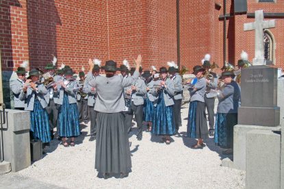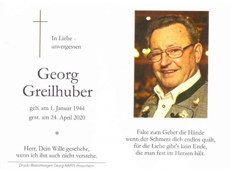 Der im Alter von 76 Jahren am 24. April verstorbene Georg Greilhuber aus Übersee wurde aufgrund der Corona-Zeit erst jetzt auf dem Friedhof von Übersee zu Grabe getragen. Georg Greilhuber wünschte sich kurz vor seinem Tod, dass seine Beerdigung erst dann erfolgen soll, wenn die musikalische Gestaltung durch die groß besetzte Blaskapelle von Prien möglich ist, dieser gehörte er über 60 Jahre als aktiver Musikant an.