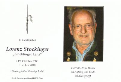Eine große Trauergemeinde fand sich ein, als in der Priener Pfarrkirche „Maria Himmelfahrt“ das Requiem für den im Alter von 76 Jahren verstorbenen Landwirt Lorenz Stockinger gefeiert wurde. Gemeindereferent Werner Hofmann erinnerte an das Leben von Lorenz Stockinger, der in Griebling bei Prien mit fünf Geschwistern auf dem elterlichen Bauernhof aufwuchs, in Prien die Volksschule besuchte und ebenfalls in Prien bei der Landwirtschaftlichen Berufsschule den Beruf des Landwirts erlernte. 1972 übernahm er den Hof und ein Jahr später heiratete er Anna Hilger aus Söllhuben. Vier Kinder und 12 Enkelkinder kamen aus dieser Ehe hervor. Herbe Schicksalsschläge waren im Jahr 2000 der Tod seiner Frau im Alter von erst 56 Jahren und im Jahr 2011 eine Krebs-Diagnose. „Neben der Familie waren für Lorenz Stockinger der Stall, der Obstgarten, der Wald, die Natur, die Heimatgeschichte und Ausflüge seine Leidenschaft, der Sonntags-Gottesdienst und der anschließende Frühschoppen waren ihm heilig“ – so Gemeindereferent Werner Hofmann. Eng verbunden war der „Grieblinger Lenz“ mit den Ortsvereinen. Stellvertretender Vorstand Klaus Löhmann vom Trachtenverein Prien dankte dem Ehrenmitglied für sechs Jahrzehnte der Vereinstreue und vor allem dafür, dass er sich 27 Jahre als Fähnrich und Fahnenbegleiter zur Verfügung stellte. Hans Berger vom Rauch-Club Prien würdigte ebenfalls die jahrzehntelange Mitgliedschaft. Für die Vorstandschaft des Atzinger Trachtenvereins „Daxenwinkler“ dankte Anton Hötzelsperger dem Verstorbenen dafür, dass dieser stets zugegen war, wenn Versammlungen oder Versteigerungen in Atzing waren, bei der heurigen Herbstversammlung wäre Lorenz Stockinger für 50 Jahre Mitgliedschaft geehrt worden. Erinnert wurde auch daran, dass die „Grieblinger-Familie“ traditionell am 26. Juli am Namenstag der Heiligen Anna zum Gottesdienst an der Anna-Kapelle vor dem Bauernhof eingeladen hat. Auf dem Friedhof spielten Priener Blasmusikanten Trauerweisen.