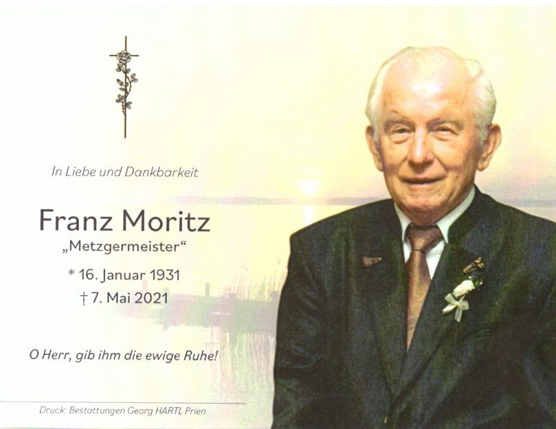 Dem noch selbst vom Verstorbenen verfassten Lebenslauf, den der Geistliche vortrug, war zu entnehmen, dass Franz Moritz als zweiter Sohn von Gast- und Landwirtsleuten in Albaching zur Welt kam, dort die Volksschule besuchte und im elterlichen Betrieb mithalf. 1951 begann er eine Metzgerlehre in Altötting, fünf Jahre später besuchte er die Meisterschule in Landshut und kam dann zu einjährigen Arbeitsstellen in Simbach am Inn und München-Grünwald. Bei seiner ersten Meisterstelle in Rosenheim lernte er seine Frau Elfriede kennen, heiratete sie 1965 und gründete mit ihr 1970 in Prien ein eigenes Geschäft. Der Ehe gingen die zwei Söhne Franz und Christian und eine Tochter hervor, die Tochter Christine verstarb im Alter von nur fünfeinhalb Jahren an Leukämie. Bis zum Jahr 2000 half Franz Moritz im Geschäft mit und wo immer es ging, machte er sich auch im hohen Alter noch nützlich. Eine besondere Freude hatte er an seinen beiden Enkelkindern und an Reisen.