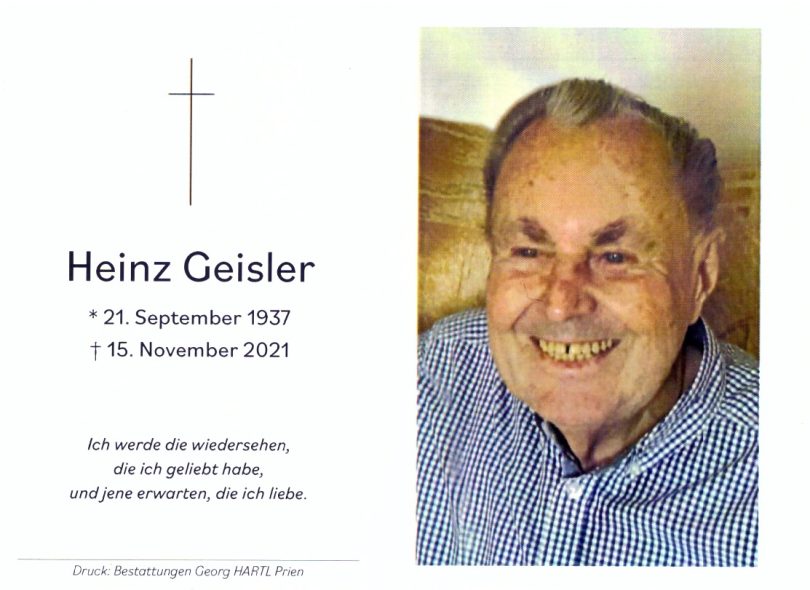 Im Alter von 84 Jahren verstarb völlig überraschend Heinz Geisler aus Prien. Der langjährige Leiter der Priener Poststelle erfreute sich über seine Familie hinaus großer Wertschätzung bei seinen Freunden und bei den Vereinen. Pfarrer Mirko Hoppe von der Evangelisch-Lutherischen Gemeinde Prien erinnerte bei der Trauerfeier in der Evangelischen Christuskirche an einen Mitmenschen, der gerne gelebt hat, einen ganz eigenen Humor hatte und nunmehr friedlich von dieser Welt abberufen wurde.