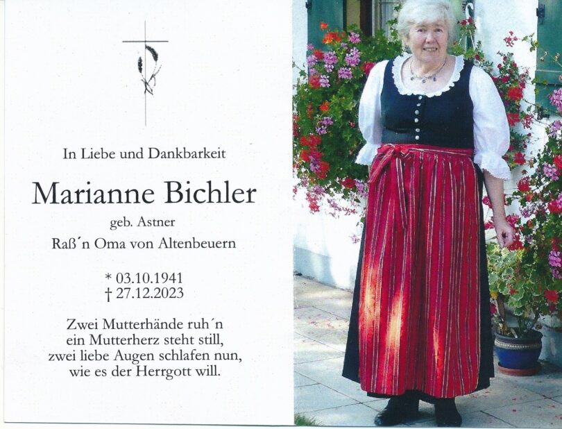 Pfarrer Christoph Rudolph sprach die Gebete und Worte der Kirche, verbunden mit dem Dank für ihre Hingabe an die Glaubensgemeinschaft. Der Kirchenchor und die Trauermusik gestalteten die feierliche Messe. Eine große Anzahl von Trachtenträgern, angeführt von den Musikanten und den Fahnen der Trachtenvereine Altenbeuern und Degerndorf sowie der Frauengemeinschaft, begleitete Marianne Bichler auf ihrem letzten Weg zur Ruhestätte neben ihrem verstorbenen Mann.