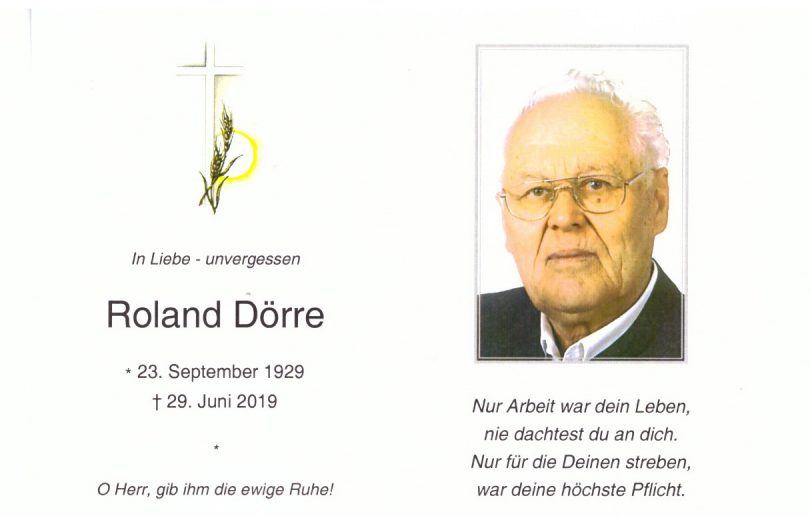 Nur wenige Monate vor seinem 90. Geburtstag verstarb nach schwerer Krankheit Roland Dörre aus Prien-Gaishacken. Bei der Trauerfeier in der Pfarrkirche „Christkönig“ und auf dem Wildenwarter Friedhof bei musikalischer Gestaltung durch den Wildenwarter Kirchenchor und durch Wildenwarter Bläser erinnerte Kaplan Stefan Leitenbacher an das lange Leben und gute Wirken des Verstorbenen für seine Familie sowie für die Allgemeinheit und für die Ortsvereine.