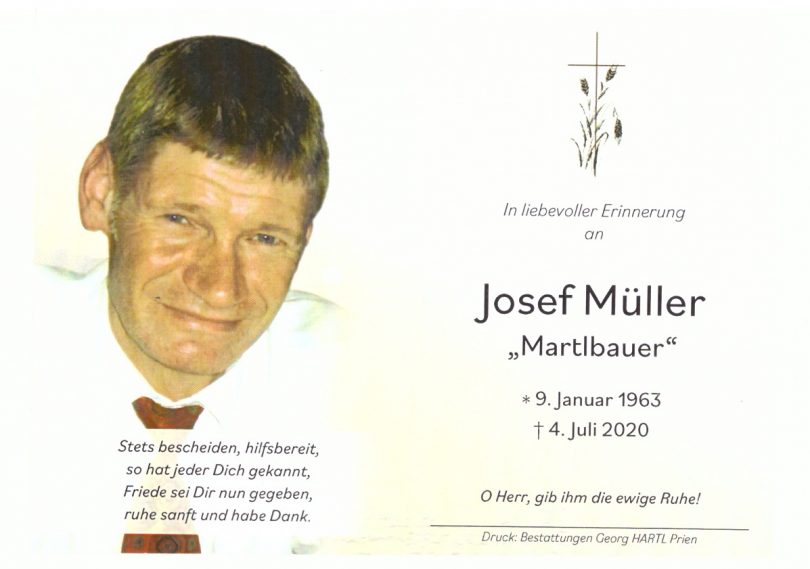 Im Alter von erst 57 Jahren ist plötzlich und unerwartet Josef Müller, Bauer vom Martlhof in Prien-Stetten verstorben. Beim Requiem in der Pfarrkirche „Christkönig“ von Wildenwart würdigte Pater Joshy den Verstorbenen als einen liebenswürdigen, bescheidenen, stets hilfsbereiten und fleißigen Landwirt für den die ihm anvertrauten Tiere und die Natur eine sehr hohe Bedeutung hatten. Die musikalische Gestaltung der Trauerfeier übernahmen Mitglieder des Wildenwarter Kirchenchores mit Orgelbegleitung. Auf dem Friedhof erinnerte Vorstand Michael Schlosser vom Trachtenverein „Daxenwinkler“ Atzing daran, dass Sepp Müller sechs Jahre lang der Kinder- und Jugendgruppe sowie 10 Jahre bei den Aktiven mit dabei war. Zudem war er einer von sechs Gründungs-Mitgliedern der Atzinger Goaßlschnalzergruppe, der er 21 Jahre lang aktiv angehörte. Von 1980 bis 1995 unterzog er sich als Mitglied der Atzinger Feuerwehr verschiedenen Leistungsprüfungen. Wie Vorstand Martin Loferer in seinem Nachruf-Dank ausführte, erreichte Sepp Müller dabei mit Erfolg die Endstufe Gold-Rot. Als Zeichen der Wertschätzung waren der Trachtenverein und die Feuerwehr mit ihren Fahnenabordnungen zugegen und sie legten jeweils einen Kranz nieder. Die Atzinger Goaßlschnalzer legten als Zeichen ihrer Verbundenheit eine Blumenschale am Grab ab.