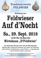 Am Samstag, 29. September veranstaltet der Feldwieser Trachtenverein seinen Feldwieser Auf D´Nocht und blickt zu diesem Saisonabschluss auf die vergangenen 12 Monate und die zahlreichen Aktivitäten zurück. Unsere Goaslschnalzer, Auftritte der Kinder- und Jugendgruppe sowie der Aktiven und die musikalische Umrahmung durch die Räsedenz Musi, Korbinian Hiendl mit der Ziach sowie die Alphornbläser werden uns einen kurzweiligen Abend im Kreise der Feldwieser Trachtler schenken.