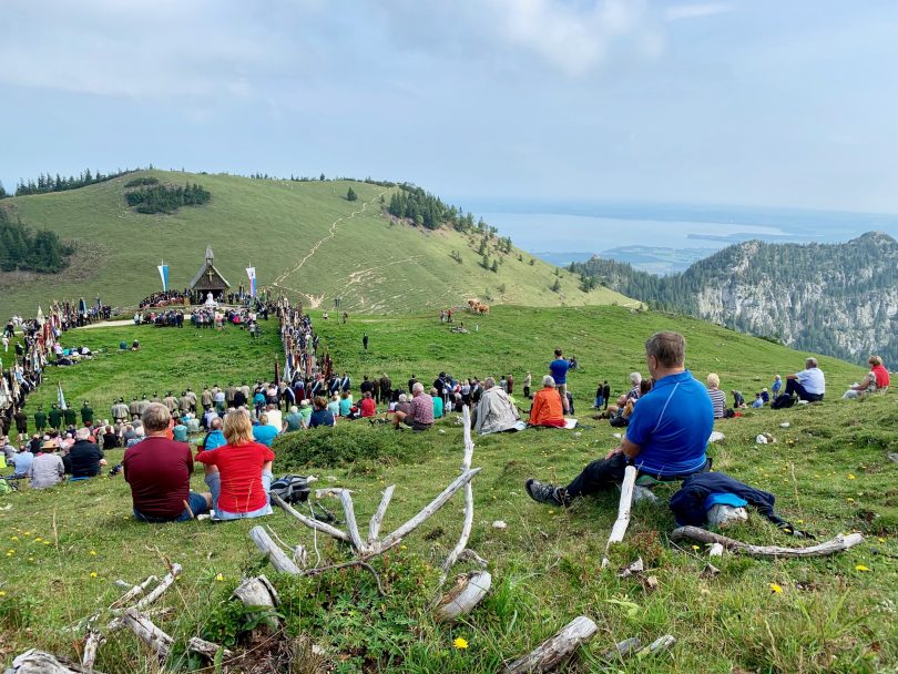 Während ganz Deutschland im Spätherbst seiner Toten gedenkt, wird im Chiemgau darüber hinaus immer am letzten Sonntag im August an alle Opfer der beiden Weltkriege erinnert. Die Gedenkfeier wird mit einem Berggottesdienst am Fuße des als Mahnmal fungierenden Gipfelkreuzes auf der Kampenwand abwechselnd von einer Gemeinde / Stadt des Landkreises Rosenheim bzw. Traunstein in Zusammenarbeit und den dort jeweils ansässigen Veteranenvereinen ausgerichtet. 2022 wird die Stadt Traunstein mit dieser ehrenvollen Aufgabe betraut. So wird am Sonntag, 28. August vor der Gedächtniskapelle „Maria, Königin des Friedens“ östlich der Steinlingalm um 10.30 Uhr eine Bergmesse zelebriert. Angesichts der traumhaften Kulisse sowie der Mitwirkung einer Vielzahl von Fahnenabordnungen, Gebirgsschützen und Musikern, wird diese Gedenkfeier zu einem außergewöhnlichen Ereignis. Bei sehr schlechtem Wetter wird die Messe in die Pfarrkirche Aschau verlegt. Die Kampenwand-Seilbahn fährt bereits ab 7 Uhr morgens; bis 9.30 Uhr gibt es anlässlich der Messe vergünstigte Tarife.