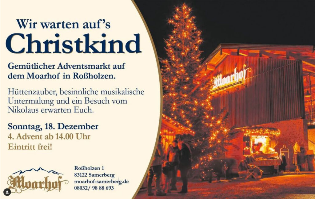 Am Sonntag, 4. Advent, findet auf dem Moarhof Roßholzen ab 14 Uhr ein gemütlicher Adventsmarkt statt. Ob Krippenspiel, Glühweinstand oder besinnliche Musik. Der kleine aber feine Christkindlmarkt auf dem Moarhof hat seinen ganz besonderen Charme. Es warten kulinarische Köstlichkeiten, Hüttenzauber, besinnliche musikalische Untermalung und ein Besuch vom Nikolaus. Der Eintritt ist frei. Das Moarhof – Team freut sich, dass nach zwei Jahren Pause wieder ein Adventsmarkt auf dem Moarhof stattfinden kann. Mit dabei ist u. a. ein Alpaka-Stand mit Sachen, die aus Wolle der Alpakas gefertigt werden, also von Seife über Socken bis hin zu Mützen und Stirnbändern. Es gibt aber auch einen Stand mit lauter von Hand geknoteten Sachen für Eure Vierbeiner wie Halsbändern, Leinen und Halftern. Weiter gibt es auch handverlesenen und handgefertigten Schmuck wie Ringe, Ketten und Armbändchen. Es gibt übrigens auch leckere Torten von Francesca aus Achenmühle, oder handverlesene Weine von Winzz Weinschorle, sowie Einzelstücke in Sachen Kinderkleidung und vieles mehr. Es ist sicherlich eine gute Gelegenheit die vielleicht noch fehlenden Geschenke für Weihnachten zu finden! Vorbeizuschauen lohnt sich also ganz bestimmt für jeden.