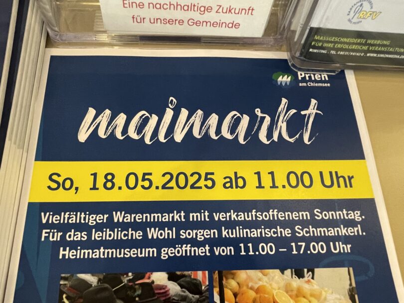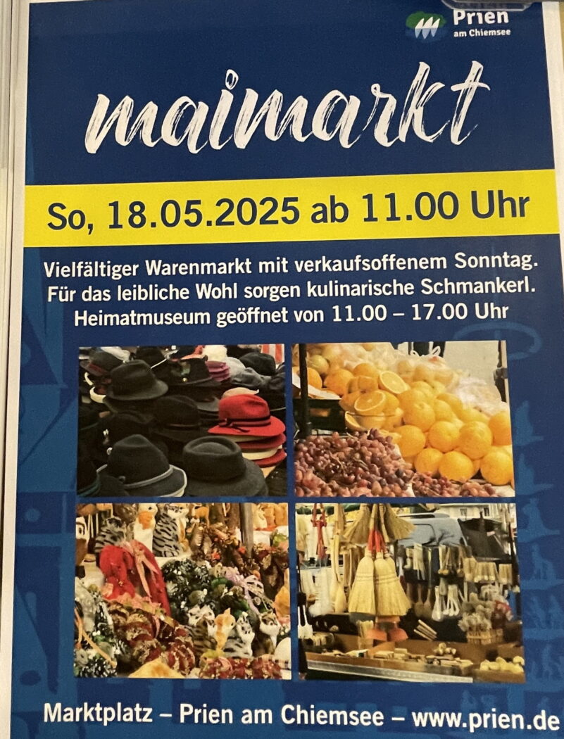 Mai-Markt in der Marktgemeinde Prien am Sonntag, 18. Mai. Ab 11 Uhr präsentieren sich am verkaufsoffenen Sonntag die Fieranten zu einem Warenmarkt mit kulinarischen Schmankerln.