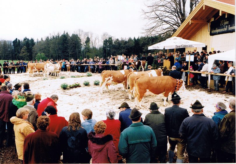 Die Gründung der Viehzuchtgenossenschaft Rosenheim-Ost erfolgte am 25. August 1977 im Gasthaus Weingarten auf der Ratzinger Höhe, nachdem das Tierzuchtamt Traunstein 1977 auf-gelöst wurde. Die Milchleistungsprüfung wurde für den gesamten Landkreis Rosenheim dem Tierzuchtamt Miesbach zugeteilt. Zuchtberatung und Vermarktung sollten folgen, und damit eine über 100-jährige Tradition gebrochen wer-den. Mit diesem Vorhaben der staatlichen Land-wirtschaftsverwaltung waren die Züchter der Chiemsee Gemeinden nicht einverstanden. Schließlich wurde 1894 die 1. Pinzgauer Vieh-zuchtgenossenschaft auf dem Samerberg gegründet. Am 29. August 1896 erfolgte dann in Traunstein der Zusammenschluss von acht Viehzuchtgenossenschaften zum „Verband für Reinzucht des Pinzgauer Rindes in Oberbayern“. Nachdem der Samerberg im Zuge der Ras-senumstellung auf Fleckvieh bereits 1968 dem Miesbacher Zuchtgebiet zugeteilt wurde, verblieben die westlichen Chiemsee Gemeinden beim Traunsteiner Zuchtverband. Außerdem war die Verkehrsanbindung nach Traunstein günstiger und mit dem Neubau der Chiemgau-halle eine hervorragende Vermarktungshalle entstanden.