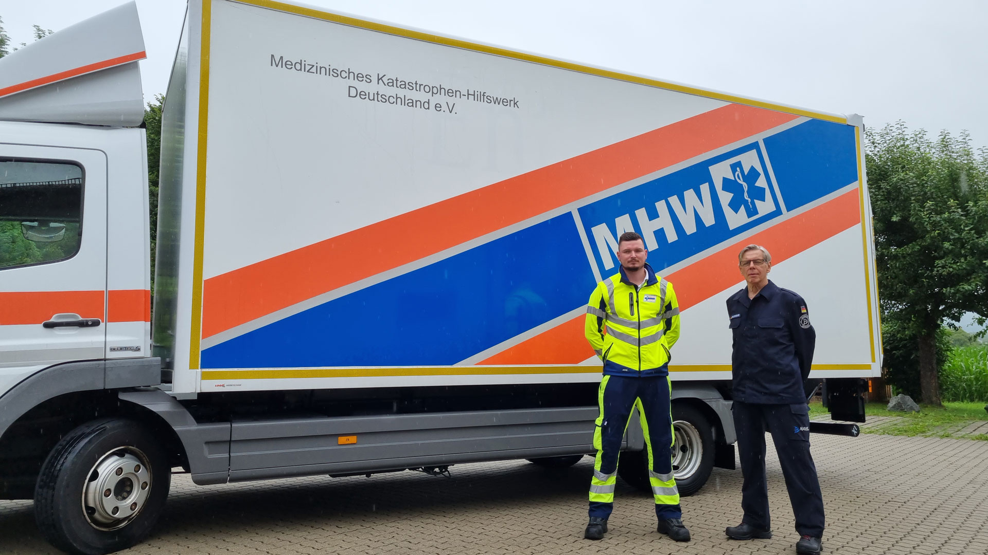 Maximilian Pink (Ambulanz Rosenheim e.V.) und Hans Kerschbaumer (NAVIS e.V.) mit dem GW Logistik auf dem Weg in das Katastrophengebiet
