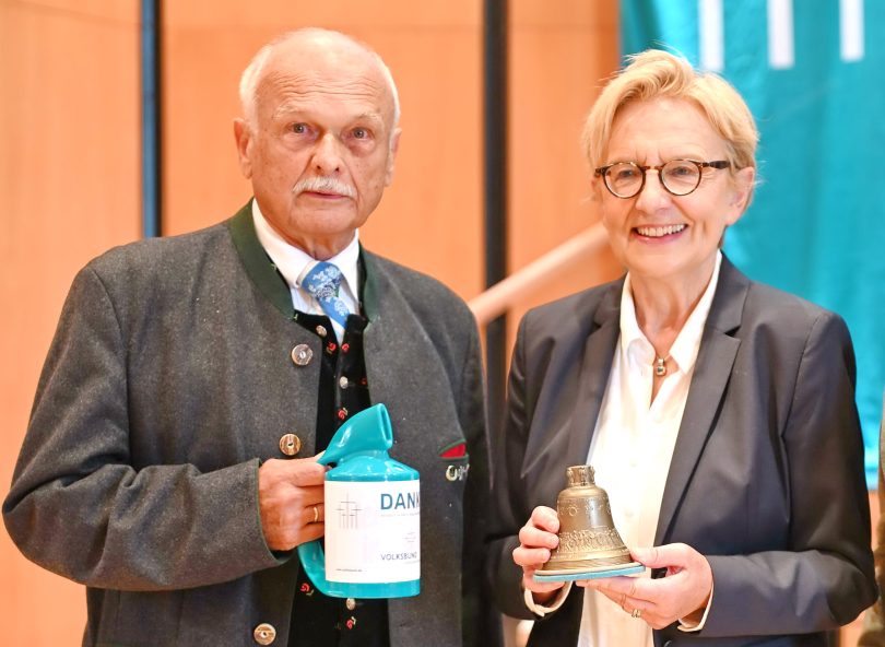 „Zur Leitung der künftigen Vorstandssitzungen erhalten Sie die Sitzungsglocke, eine Miniatur der Glocke von Rovereto und symbolisch eine Sammelbüchse für eine der wichtigsten Aufgaben des Verbandes, die alljährliche Haus- und Straßensammlung des Volksbundes Deutsche Kriegsgräberfürsorge“, so der scheidende Vorsitzende des Volksbund Bezirkverbands Oberbayern Heinrich Rehberg zu seiner Nachfolgerin Regierungspräsidentin a.D. Maria Els. Bei der 15. Tagung der Ehrenamtlichen des Volksbundes aus ganz Oberbayern in Dachau übergab Rehberg das Ehrenamt an seine Nachfolgerin.