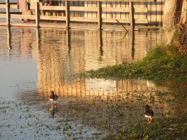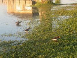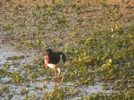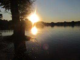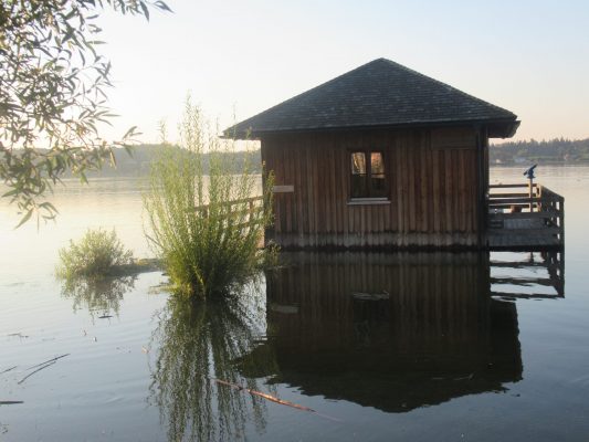 Mehrere Tage nach dem Starkregen steht das Chiemseeufer an vielen Stellen immer noch unter Wasser. Auch an der Prienmündung kommt man trockenen Fusses nicht in die Vogelbeobachtungshütte oder auf die Bank am Ende der Landzunge. Die Wasservögel geniessen das, am überfluteten Ufer finden sie im Schein der untergehenden Sonne noch jede Menge Leckerbissen.