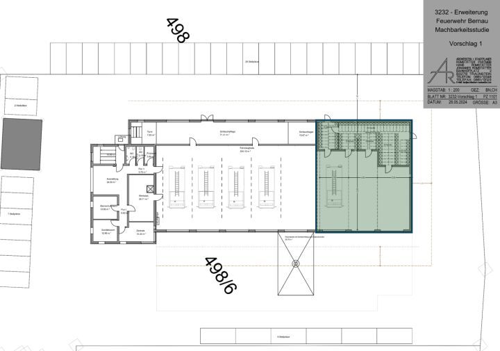 Weiter wurde der Bau einer alleinstehenden Kalthalle oder Halle geprüft. Eine Kalthalle kommt nicht in Frage, da die Container frostsicher gelagert werden müssen, da es sich um Löschwasser bzw. technische Ausrüstung handelt, die sich darin befindet. Eine einzelne Halle könnte nicht an die technischen Anlagen (Heizung, Lüftung, etc.) des bestehenden Feuerwehrhauses angeschlossen werden und wird somit als weniger wirtschaftlich beurteilt als ein Anbau.