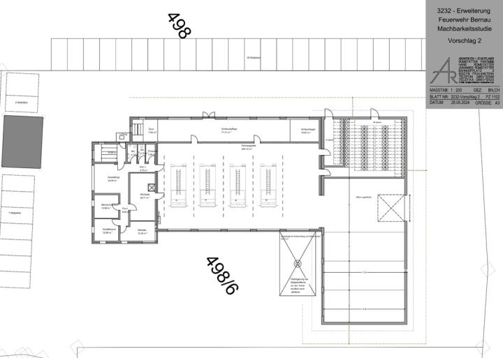 Variante 2 weist am meisten Potential auf für die Zukunft und ist ein L-Bau. Hier finden sowohl alle Container des Wechselladers ihren Platz wie auch die Duschen und Umkleiden. Es können zudem mehr Umkleiden angelegt werden, um auch dem künftigen Wachstum der Anzahl ehrenamtlichen Feuerwehrler gerecht zu werden. Die geschätzten Kosten belaufen sich auf 2,23 Mio €, hier kann aber mit einer Förderung von 270.000€ gerechnet werden, da im Vergleich zur Variante 2b ein Stellplatz mehr entstehen kann.