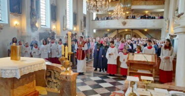 Gemeindereferent Tobias Gaiser brachte in seiner Predigt zwei Erfahrungen in Erinnerungen. Einmal die Unbekümmertheit als Jugendlicher in seiner Pfadfinderzeit als er im Leichtsinn einen mutigen Sprung ins Wasser tat und dabei fast sich und andere verletzt hätte. Und dann den Turmbau zu Babel mit der Erkenntnis: „Mensch, wenn Du zu hoch steigst, dann kannst Du auch tief fallen“. Konkrete Zukunftssorgen wurden in die vorgetragenen Fürbitten gelegt und diese ließ man mit reichlich Weihrauch zu Gott aufsteigen.