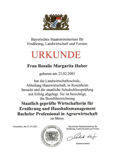 Für Vater Johann Huber ist der erfolgreiche Meisterabschluss etwas stolz und froh Machendes wenn er feststellt: „Meine Frau Margarita, die ebenfalls Meisterin für Garten und Pflanzen ist, konnte der Rosalie ebenso beistehen wie der ganze Käsereibetrieb. Wichtig ist für mich, dass meine drei Kinder und das ganze Käserei-Team weiterhin zusammenhelfen und eine gemeinsame Zukunft haben“. Im Übrigen waren es zum Anfang des ersten Semesters 24 Teilnehmer, letztlich waren es noch 21 und all diese schafften die Prüfung.