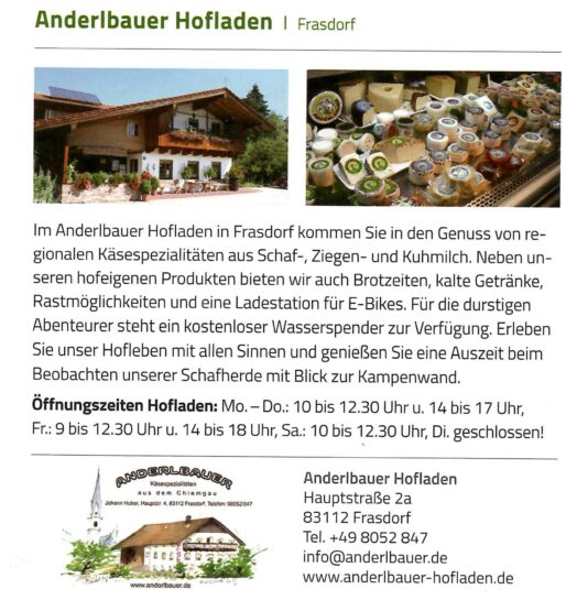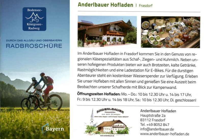 Der Anderlbauer Hofladen aus Frasdorf ist in der neuen Bodensee-Königssee-Radbroschüre “Durch das Allgäu und Oberbayern” als eines der vielen Besuch-Tipps enthalten. In der Broschüre heißt es wie folgt: