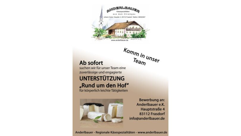 Eine zuverlässige und engagierte Fachkraft zur Unterstützung für Aufgaben “rund um den Hof” mit leichten körperlichen Tätigkeiten sucht die Bio-Käserei Anderlbauer aus Frasdorf zum nächstmöglichen Zeitpunkt.