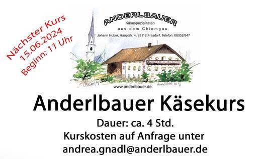 Auf großes Interesse stoßen immer wieder die Käsekurse beim Anderlbauer in Frasdorf. Das Kurs-Erlebnis beinhaltet unter anderem Informationen zum Käse-Selbermachen, Käse selber herstellen, eine Käseverkostung, eigens hergestellten Weichkäse zum Mitnehmen, ein Käsediplom und eine Folgebelehrung nach § 43 IFSG.
