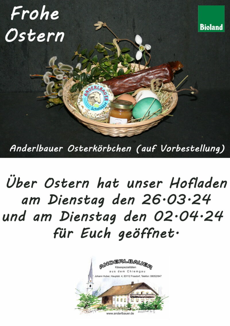 Für die Zeit über Ostern bietet der auf Vorbestellung Osterkörbchen aus seinem Direktvermarktungssortiment an. Der Hofladen hat vor Ostern am Dienstag, 26. März und nach Ostern am Dienstag, 2. April geöffnet.