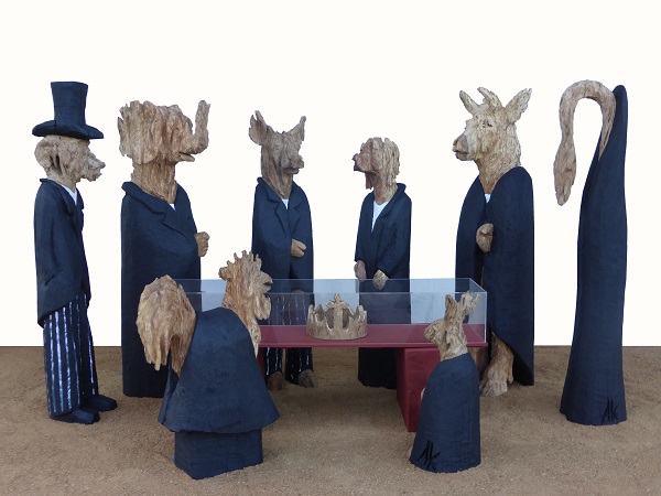 Bereits vor zwanzig Jahren faszinierte der Unterwössener Künstler Andreas Kuhnlein mit seiner Ausstellung „Tischbildnisse – Menschenbildnisse“ die Besucher des Holztechnischen Museums. Seinen Holzskulpturen, die Situationen im menschlichen Leben, von Macht und Vergänglichkeit, Zerwürfnissen, Übermut, Umkehr und Einsicht symbolisieren, fanden seither Eingang in zahlreichen Museen und Ausstellungen im In- und Ausland und führten den Künstler unter anderem in die USA ebenso wie nach Korea, Kanada und China. Kuhnleins mit der Motorsäge filigran aus einem Stamm oder Altholz herausgearbeiteten Figuren sind ein ebenso symbolhaftes wie ausdrucksstarkes Genre zeitgenössischer Holzbildhauerei.
