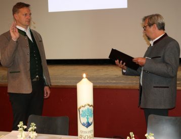 “Ich schwöre Treue dem Grundgesetz der Bundesrepublik Deutschland und der Verfassung des Freistaates Bayern“, Simon Frank (ZfA) und Michael Andrelang (CSU) führen künftig die Gemeinde Aschau als erster und zweiter Bürgermeister, die bisherige dritte Bürgermeisterin Monika Schmid (FWG) wurde einstimmig in ihrem Amt bestätigt. Sofort nach der Vereidigung überreichte Bürgermeister Frank seinen beiden Stellvertretern einen Rathausschlüssel und erklärte dazu, dass sie im Rahmen der allgemeinen Transparenz ständig Zutritt zum Aschauer Rathaus und zu ihm haben werden. Die Zuhörer in der Aschauer Festhalle – darunter Bürgermeister a.D. Werner Weyerer, die Aschauer Geistlichen beider Konfessionen sowie die Ehrenbürger und Bürgermedaillenträger nahmen diese Geste mit sichtlichem Wohlwollen auf.