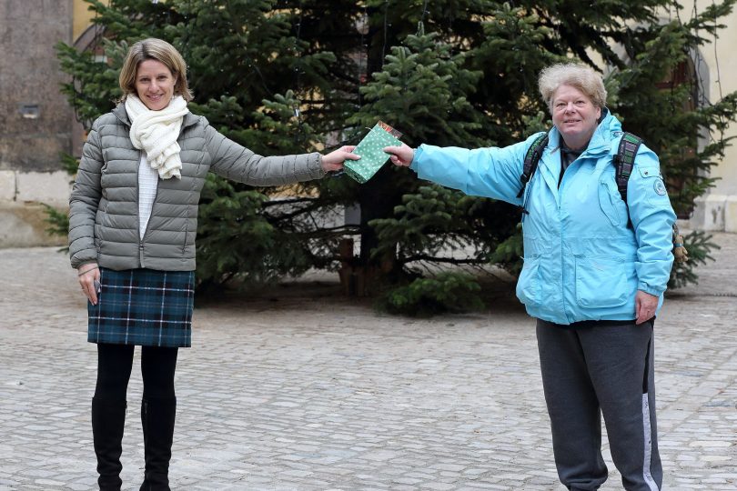 Bürgermeisterin Dr. Freudenstein überreichte Karten für das Benefizkonzert am Heiligen Abend – Claudia Bernhard vom Regensburger Donaustrudl freute sich sichtlich über das Weihnachtsgeschenk für die Verkäuferinnen und Verkäufer des Sozialmagazins. Als Dank für ihr soziales Engagement erhielten sie Eintrittskarten für das traditionelle Benefizkonzert des Theaters am Bismarckplatz, das in diesem Jahr wieder am Heiligen Abend stattfinden soll.