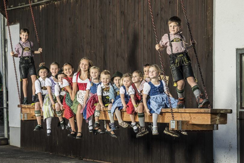 Den Spruch “A richtiga Kirta dauert bis zum Irta, wer se do ned ko daschika, der feiert bis an Migga” haben die Kinder des Trachtenvereins “Edelweiß” Niederaschau noch fortgeführt gemäß dem Motto: “Wens gor so sche is wia heia, dann hutscht ma no a bor dog weida”. Welche Freuden die Kinder dabei haben, zeigt diese Aufnahme auf dem Daurer-Hof von Niederaschau.