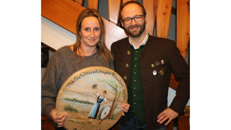 Bildunterschrift: Schützenmeister Rupert Marinus Wörndl (rechts) übergibt Anja Preuße, der 24. Dorfschützenkönigin von Frasdorf, die Siegerscheibe.