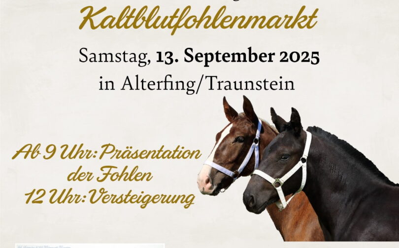 Am Samstag, 13. September findet in Alterfing bei Traunstein ein großer Chiemgauer Kaltblutflohenmarkt statt. Hierzu lädt der Pferdezuchtverband Oberbayern e.V. ein.