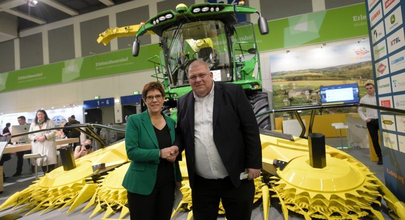 Mit einer herzlichen Begrüßung durch Landwirtschaftsministerin Julia Klöckner in der Blumenhalle begann CDU-Parteichefin und Bundesverteidigungsministerin Annegret Kramp-Karrenbauer ihren Rundgang über die IGW am 23. Januar 2020. Nach einem Besuch beim Zentralverband Gartenbau traf sie auf dem Erlebnisbauernhof in Halle 3.2 unter anderem Vertreter des Bauernverbandes, der Landfrauen und der Landjugend. Johannes Kamm, Geschäftsführer des Zentralverbands des Deutschen Bäckereihandwerks, überreichte der Politikerin ein Weizenmischbrot mit persönlicher Widmung. Den passenden Aufstrich, einen deutschen Bienenhonig, erhielt sie nebenan beim Deutschen Imkerverband. Das Anliegen der Imker, unversiegelte Flächen zum Schutz der Bienen zu erhalten, nahm Kramp-Karrenbauer mit zum Bundesamt für Infrastruktur, Umweltschutz und Dienstleistungen der Bundeswehr in Halle 27. Am Stand überzeugte sie sich auch von der Nachwuchsakquise der Truppe. Ein spontanes Abschlussfoto mit Labrador-Retrievern gab es gegenüber beim Deutschen Jagdverband.