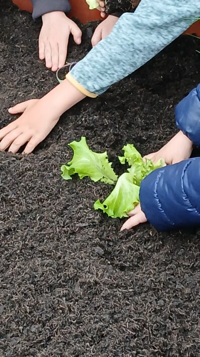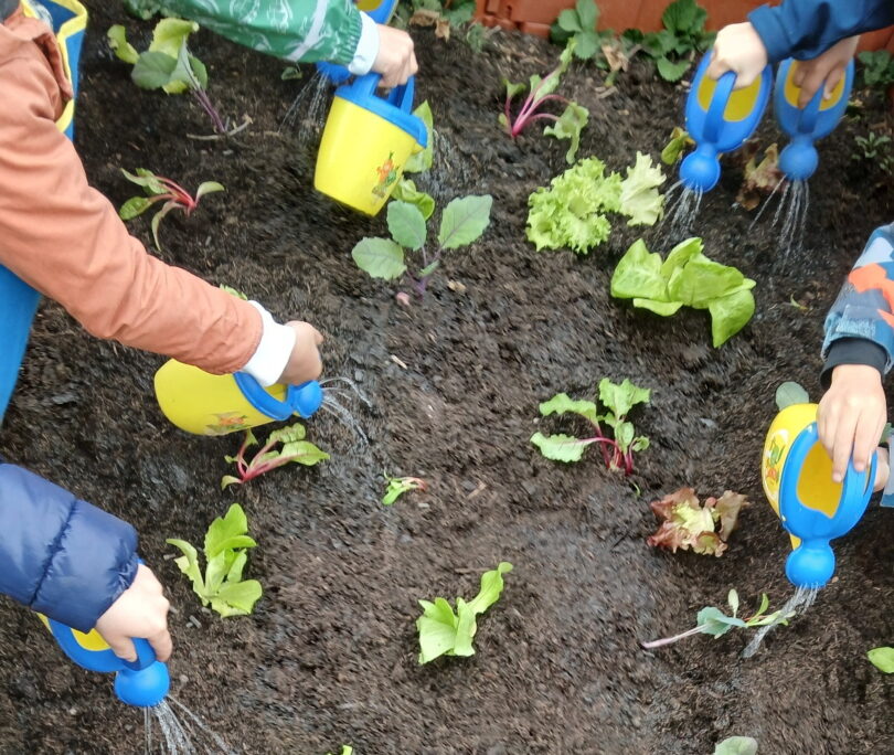 Diese Woche säten und pflanzten die Kits des Kindergartens *Spatzennest Aschau* zusammen mit 2 Mitarbeitern der EDEKA Stiftung ihr Hochbeet. Auch der Marktleiter Mike Löwa des örtlichen EDEKA Marktes, der das Projekt als Pate begleitete, war Vorort und unterstützte die Kleinen beim Einsetzen von Salat-, Radieschen- und Kohlrabi-Setzlingen.