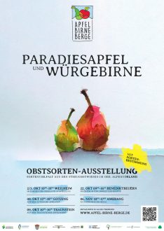 Eine bunte Obstsorten-Schau mit etwa 100 Apfel- und Birnensorten erwartet die Besucherinnen und Besucher des Bauernhausmuseums Amerang des Bezirks Oberbayern am 6. November. Die Palette reicht vom verführerisch, leuchtend-roten „Paradiesapfel“ bis hin zu unscheinbaren „Würgebirnen“, die sich zwar nicht zum Direktverzehr, umso besser jedoch für Obstbrände eignen. Zudem mit dabei sind klimatisch an die Region angepasste Sorten, Sortenraritäten sowie einige der unbekannten bzw. „vergessenen“ Regionalsorten, die über das Projekt „Apfel.Birne.Berge“ gefunden und erhalten werden.