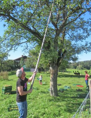 Selbst Hand angelegt hat in diesen schönen Spätsommertagen Gastwirt Florian Lerche vom Gasthaus Alpenrose in Grainbach am Samerberg als es galt die reifen Äpfel vom Baum zu schütteln und sie zu ernten. Die Apfelernte für die Alpenrose kommt gerade zur rechten Zeit, denn das Gasthaus nahe der Grainbacher Kirche mitsamt Biergarten nimmt am heurigen Kulinarischen Herbst Chiemgau & Inntal teil (www.kulinarischer-herbst.de). Dabei heißt das Motto für alle teilnehmenden Wirte im September und Oktober „Wir kochen Heimat“. Wirt Florian Lerche dazu bei seiner Apfelernte: „Meine eigenen Äpfel verwende ich unter anderem für Apfelblaukraut, für einen Aperitif mit Apfelsaft von den eigenen Äpfeln und für Apfelküchl“.