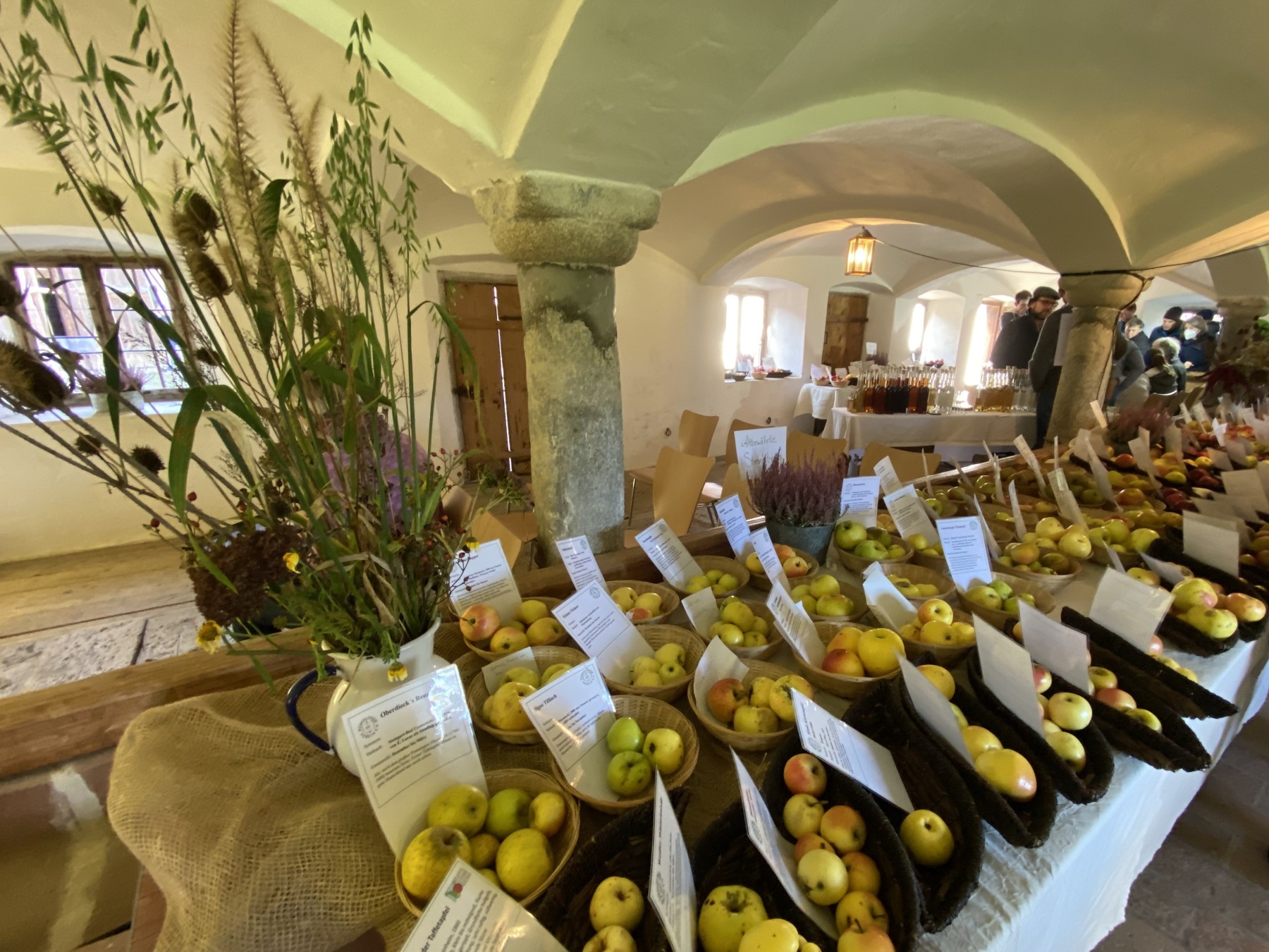 Das Biodiversitätsprojekt „Apfel-Birne-Berge“ präsentiert im Kuhstall des Vierseithofs eine große Sortenausstellung © Bezirk Oberbayern, Archiv BHM.