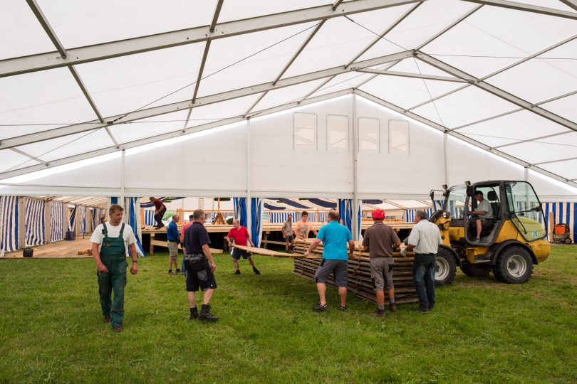 Reichlich Hand angelegt wird derzeit im Atzinger Festzelt zur Vorbereitung auf das Gautrachtenfest des Chiemgau-Alpenverbandes. Das Festzelt steht, derzeit werden die Innenarbeiten vorgenommen, so dass am Donnerstag, 27. Juli um 19 Uhr der Bieranstich beginnen kann. Vom derzeitigen Atzinger Arbeitsfleiß mit Festleiter Michael Schlosser als Koordinator einige aktuelle Eindrücke.