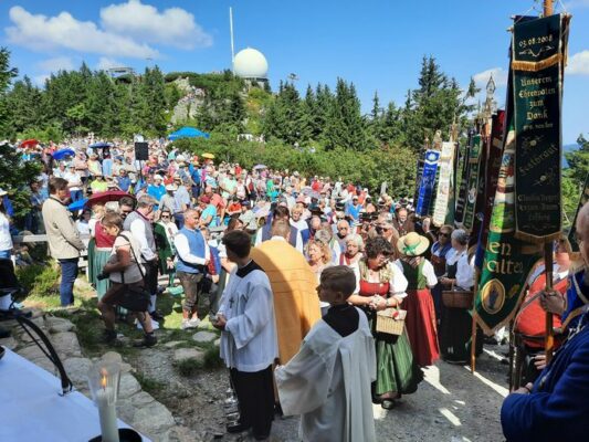 Es war ein imposantes Bild, das sich am Sonntag auf dem Bayerwaldkönig bot: Tausende Besucher, unter die sich die Repräsentanten des Bayerischen Waldvereins, des Bayerischen Waldgaues, der Landesvater Bayerns und weitere politische Prominenz mischte. Eine Premiere hatte auch der neue Arberpfarrer, Alexander Kohl, dem als Konzelebrant der Ortspfarrer von Lam und Lohberg, Ambros Trummer, zur Seite stand. Der Besuch des bayerischen Ministerpräsidenten war ein besonderes Zeichen der Wertschätzung und Anerkennung für die traditionsreiche Veranstaltung an einem besonderen Ort.